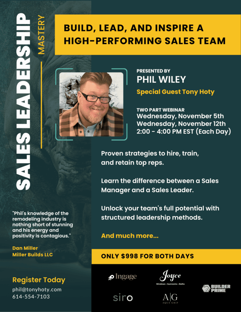 Would you invest $998 to improve your sales efficiencies, increase profits, and reduce turnover? I promise a huge return on your investment. Join Phil Wiley, a 26 year veteran of in-home sales, for the Sales Leadership Seminar presented by Tony Hoty Training and Consulting on November 5 and 12. This two part event is built for owners, managers, and emerging leaders ready to take their teams to the next level. Learn how to recruit the right people, train effectively, coach with purpose, and present with impact. You will leave equipped to build a dynamic, high performing sales team that consistently wins.