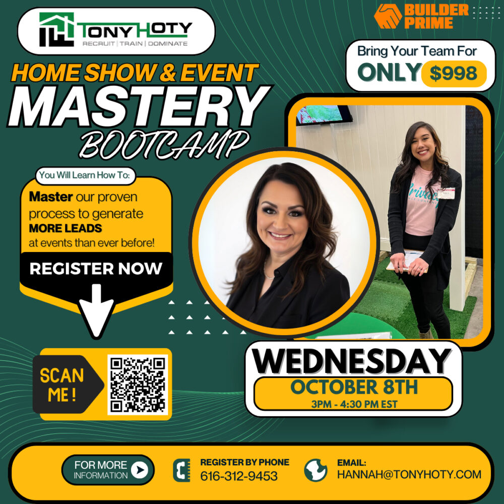 Virtual Events | Wednesday October 8th, 3pm to 4:30 pm, EST, 12/20: Home Show Preparation, Wednesday January 22nd 2pm-3:30pm Objection Handling (For all departments), Thursday February 27th 2pm-3:30pm Call Center Conversions, Wednesday April 2nd 2pm-3:30pm Rehash, Thursday May 8th 2pm-3:30pm Leadership/Team Retention, Wednesday June 11th 2pm-3:30pm Brand Ambassador Program, Thursday July 17th 2pm-3:30pm Converting Lead Aggregator Leads, Wednesday August 20th 2pm-3:30pm Special Events, Thursday September 25th 2pm-3:30pm Call Center Conversions, Wednesday October 29th 2pm-3:30pm Objection Handling + Seasonal, Thursday December 4th 2pm-3:30pm TBD BY ATTENDEES! |